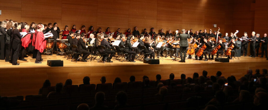 La Coral, l’Orfeó i l’Orquestra Simfònica de la URV han marcat l’inici del període nadalenc amb el ja tradicional concert de Nadal que ofereixen cada desembre. El concert, que s’ha fet aquest dimarts 16, ha tingut lloc per primer cop a l’Auditori Antoni Gaudí de Reus a causa de les obres que s’estan fent a l’Aula Magna del campus Catalunya. Les tres formacions de l’Aula de Música han ofert un repertori variat que ha finalitzat amb una peça interpretada per les tres agrupacions de manera conjunta, El dimoni del mercat”, la nadala que van estrenar l’any 2023.