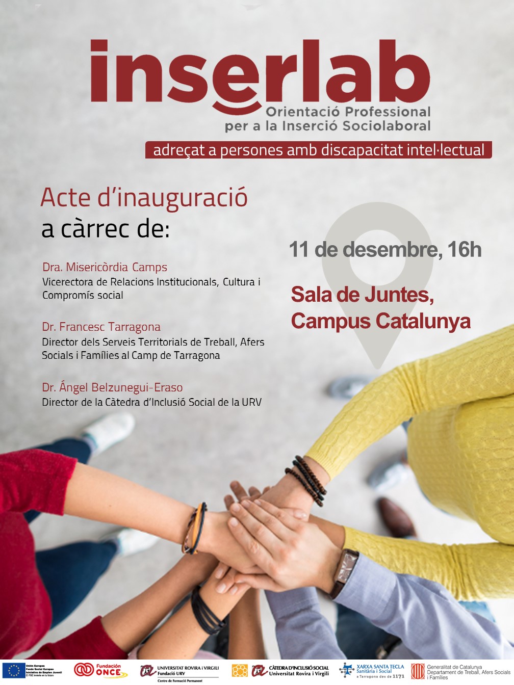 L’acte d’inauguració serà dimarts 11 de desembre, a les 16 h, a la sala de Juntes del campus Catalunya. Intervindran: Misericòrdia Camps, vicerectora de Relacions Institucionals, Cultura i Compromís social de la URV; Francesc Tarragona, director dels Serveis Territorials de Treball, Afers Socials i Família de la Generalitat al Camp de Tarragona, i Ángel Belzunegui-Eraso, director de la Càtedra d’Inclusió Social de la URV.