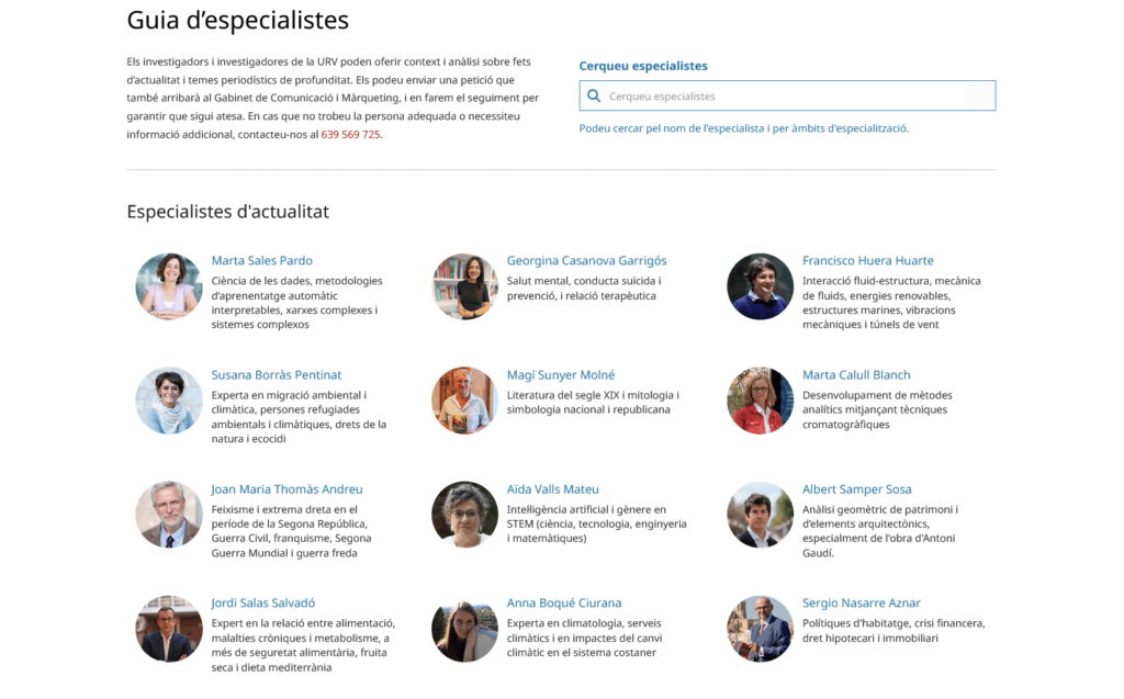 La Universitat Rovira i Virgili ha posat en marxa la Guia d’especialistes, un nou recurs que facilita el contacte entre la comunitat investigadora i els mitjans de comunicació. L’objectiu és posar a disposició dels periodistes un catàleg actualitzat d’experts i expertes de la URV que poden aportar una veu qualificada en notícies, reportatges o entrevistes sobre temes d’actualitat, alhora que afavoreix la projecció pública de la recerca de la Universitat entre els mitjans de comunicació.