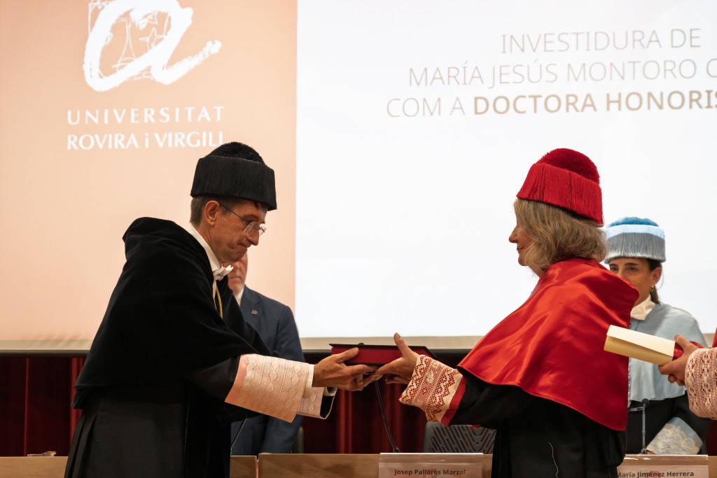 La Universitat Rovira i Virgili ha investido este viernes doctora honoris causa María Jesús Montoro, referente en el derecho ambiental y con una trayectoria académica y de investigación relevante y repleta de aportaciones en ámbitos diversos del derecho público. El Aula Magna del campus Catalunya se ha llenado de colegas, doctores i doctoras para rendir homenaje a una jurista descrita durante el acto como innovadora y pionera, sobre todo en la visibilización de la presencia de la mujer en un ámbito tradicionalmente masculinizado, y de la cual se ha valorado la capacidad de mantenerse actualizada, mucho más allá de la formación recibida en las aulas, para que el derecho, tal y como ella siempre ha defendido, avance en sintonía con la realidad social por grandes que sean los cambios vividos por la sociedad, a muchos de los cuales, incluso, se ha avanzado a menudo.