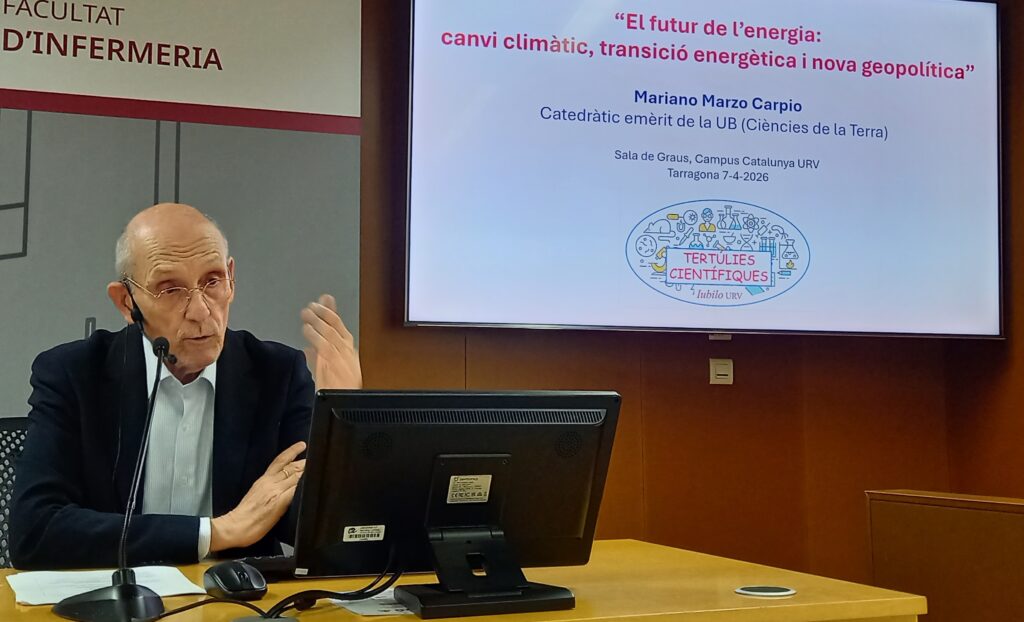 Amb el títol ben candent “El futur de l’energia: canvi climàtic, transició energètica i nova geopolítica”, Mariano Marzo Carpio, reconegut expert en temes d’energia i de medi ambient, va fer el proppassat 7 d’abril la presentació de la tertúlia científica organitzada per la comunitat Iubilo URV. La seva exposició va ser brillant, entenedora i amb una aportació de dades que il·lustren com la transició energètica cap a les renovables per frenar el canvi climàtic, de fet està marcant una nova geopolítica.