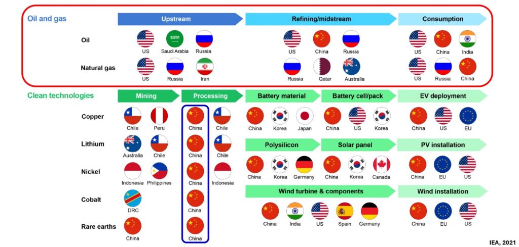 La transició energètica suposa una transició extractiva, i tot això implica uns canvis importants als països que dominen les cadenes de subministrament, i en definitiva la geopolítica energètica està canviant ràpidament, de tal manera que de fa pocs anys ençà la Xina és el país hegemònic estratègicament en tecnologia i processament dels nous recursos energètics, com es pot veure a la imatge adjunta.