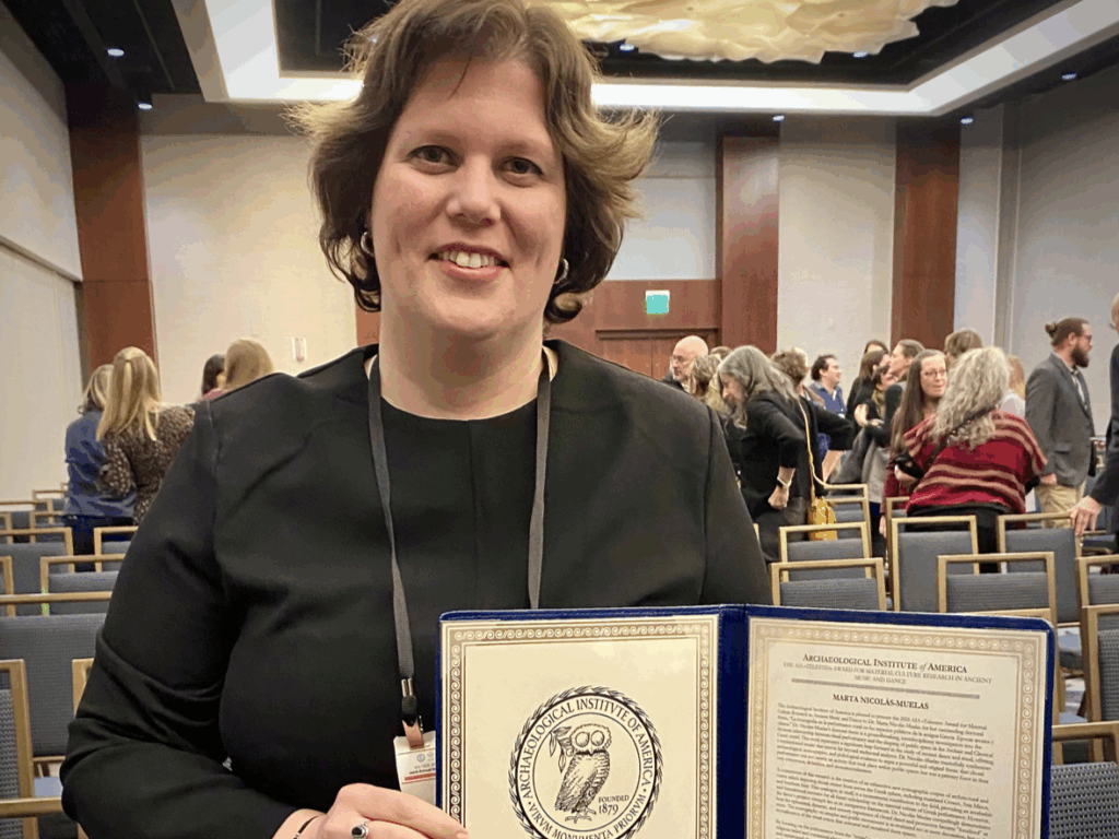 La tesi doctoral La iconografía de la performance coral en los espacios públicos de la antigua Grecia. Épocas arcaica y clásica, defensada l’any 2023 a la Universitat Rovira i Virgili (URV) per Marta Nicolás, ha estat distingida amb l’AIA–Telestes Award for Material Culture Research in Ancient Music and Dance (2026), un premi internacional atorgat per l’Institut Arqueològic d’Amèrica.