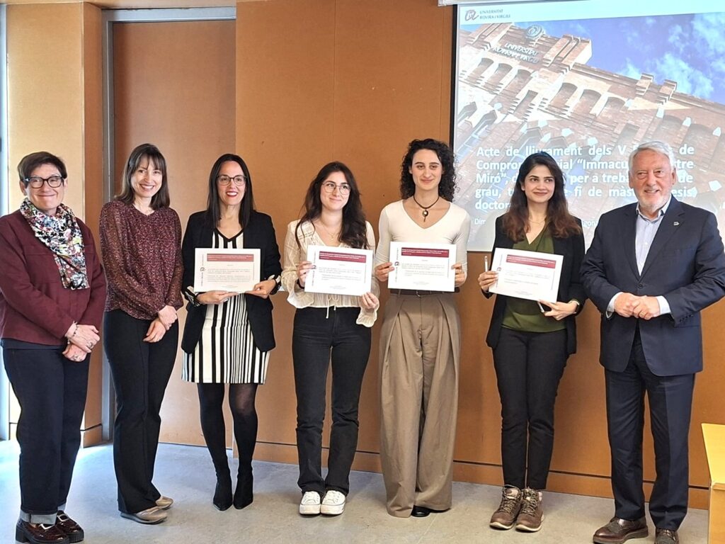 La Universitat Rovira i Virgili ha lliurat aquest dimecres una nova edició dels Premis de Compromís Social Immaculada Sastre Miró, uns guardons que reconeixen treballs de grau, màster i doctorat amb impacte social. El guardó que promou l’Oficina d’igualtat i Compromís Social reconeix treballs que tracten una necessitat definida conjuntament amb una organització o una entitat social sense ànim de lucre o que s’han fet d’acord als criteris del Programa d’Aprenentatge i Servei.