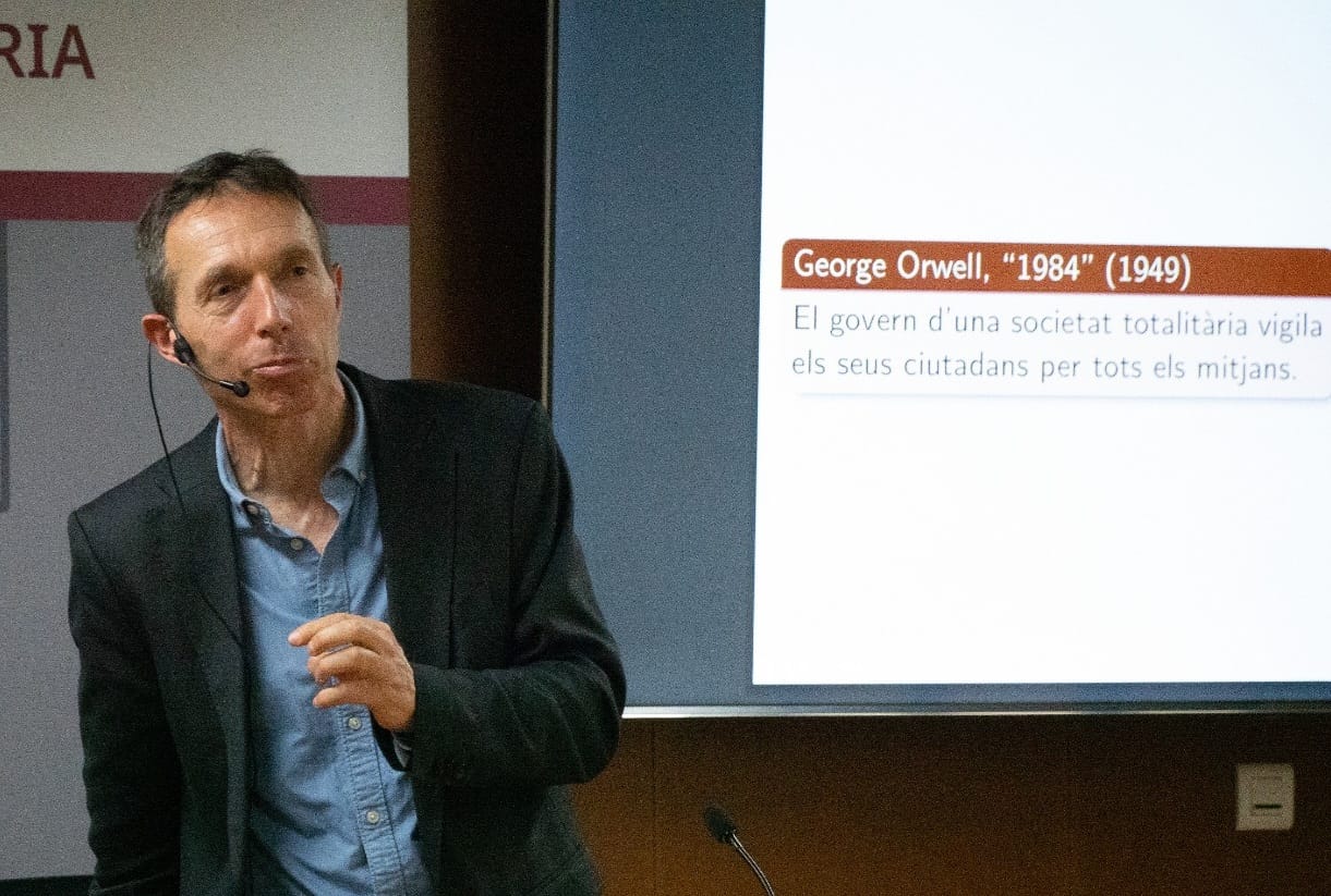 Domingo va començar recordant les ficcions distòpiques —o sigui, les utopies negatives de societats opressives i totalitàries—, com les conegudes novel·les El procés de Franz Kafka, escrita el 1925; Un món feliç (Brave New World), d’Aldous Huxley, del 1931; la de George Orwell, 1984, escrita el 1949, o el film Minority Report, de Steven Spielberg, del 2002, ficcions totes elles on els ciutadans són oprimits en base al control constant. El gran desenvolupament d’internet actual, que ens facilita la vida de moltes maneres, ha fet que es generin dades massives globals de tothom, ja que totes les activitats deixen rastre digital, que “algú” recull i guarda. Per això actualment aquelles ficcions distòpiques poden ser realitat segons com, i cal veure com protegir-se’n.